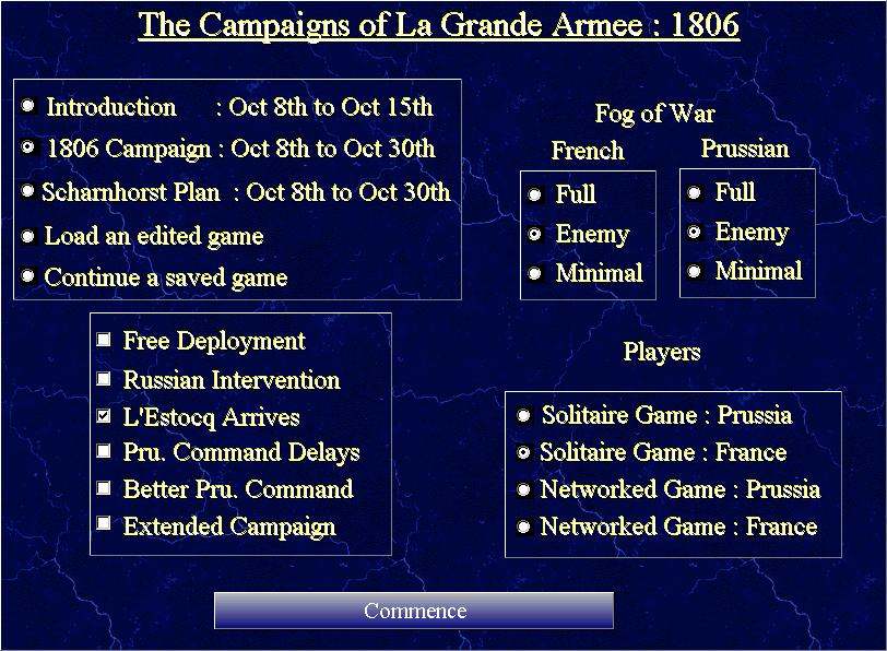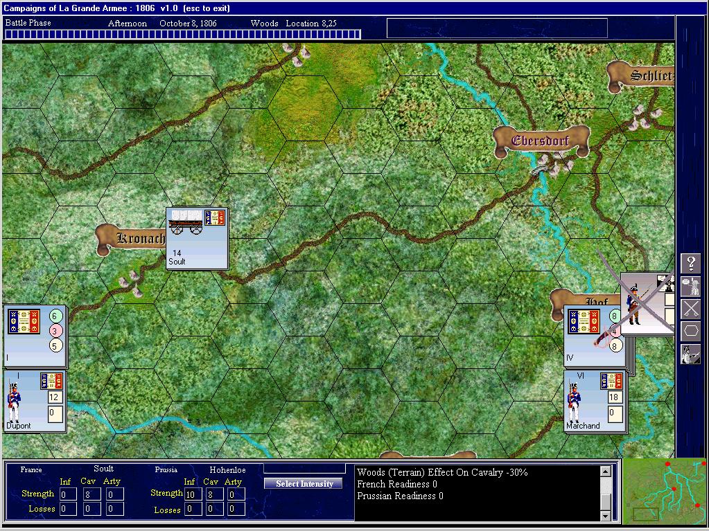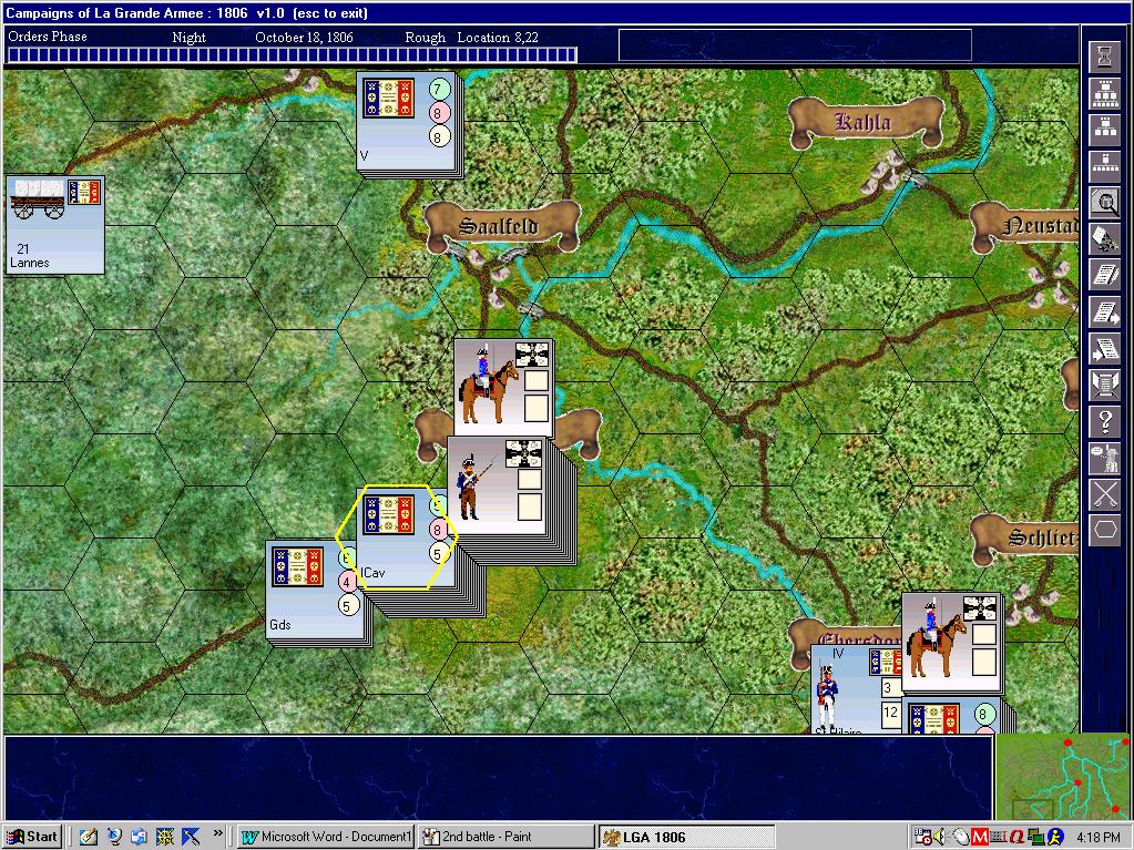 If you aren't familiar with it, La Grande Armee:1806 (hereafter LGA) is a somewhat different kettle of fish than most of the games that we are used to. Where the Battleground/Campaign series is basically tactical in nature, with each unit representing a battalion at the most, LGA is operational in scale. Each unit is a division, though really, the unit of command is the corps. There are 4 turns per day, though it may appear as only 1/day, as you have to prompt the game to get in and enter the orders in any but the morning turns.