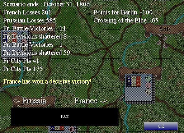 (picture)A day of major battles. An all day fight near Saalfeld, and while I took some serious losses, I've pretty much shattered the Prussian armies ahead of me. The end isn't that far away. While I haven't played this game terribly well, it seems I'm winning anyway. A very impressive list of corps surrendering and divisons surrendering.